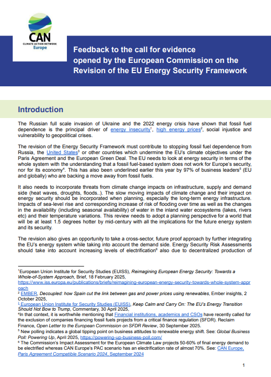 On October 13, 2025 CAN Europe has submitted response to the call for evidence opened by the European Commission on the Revision of the EU Energy Security Framework.