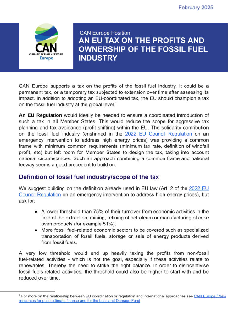 CAN Europe supports a tax on the profits of the fossil fuel industry. It could be a permanent tax, or a temporary tax subjected to extension over time after assessing its impact. In addition to adopting an EU-coordinated tax, the EU should champion a tax on the fossil fuel industry at the global level.